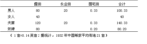 如果不能适当地为分配田地和征收以农产品为基础的赋税作出安排,中华帝国的历代王朝都不能繁荣兴旺。隋朝也不能例外。早在582年,当北方还远没有巩固,文帝就颁布了一套新法令。据说它们大部分以北齐的条例为基础,而这些条例又是根据486年北魏孝文帝采用的均田制。隋规定定期把土地分配给平民。土地分成以下几类:一、露田,由将成年和成年(隋规定的范围是从17至59岁)的受田人持有和耕种,以后要退还当局再作分配;二、可以继承的永业田,它通常种植桑麻;三、园宅田,它也可继承。这些法令规定的基本分配情况见下表:[36]
