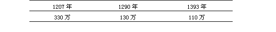 [5] 1207年的数字来自脱脱等编的[646]《金史》,卷24,第572—578页;卷25,第599—616页;卷26,第627—629页,缺少后来隶于江苏的3个州和隶于河南的7个府州的人口数字。1290年的数字,来自[653]《元史》,卷58,第1347—1383页。1393年的数字来自[184]何炳棣:《1368—1953年的中国人口研究》,表3,第10页。