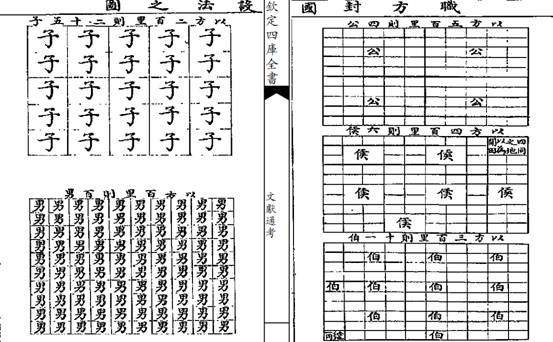 《周礼 大司徒》:"凡建邦国,以土圭正其地而制其域。诸公之地,封疆方五百里,其食者半。诸侯之地,封疆方四百里,其食者半参之一。诸伯之地,封疆方三百里,其食者参之一。诸子之地,封疆方二百里,其食者四之一。诸男之地,封疆方百里,其食者四之一。"《职方氏》:"凡邦国,千里封公,以方五百里则四公,方四百里则六侯,方三百里则十一伯,方二百里则二十五子,方百里则百男,以周知天下。"
