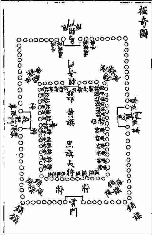 外垒,一军一万二千五百人,以十人为火,一千二百五十火。幕数一如是。幕长一丈六尺,舍十人,守地一尺六寸。以三为奇,以三千七百五十人为奇数,馀人八千七百五十人分为八阵。阵有一千九百九十七分五铢,守地一千七百五十尺。八阵积尺,守地一万四千尺。积步二千三百七十二步,馀二尺。积里六里,馀一百七十三步二尺。以垒四面乘之,一面得地一里,馀二百二十三步。垒内得地十四顷十七亩,馀一百九十步四尺五寸六分,以为外垒。天阵居乾为天门,地阵居坤为地门,风阵居巽为风门,云阵居坎为云门,飞龙阵居震为飞龙门,虎翼阵居兑为虎翼门,鸟翔阵居离为鸟翔门,蛇盘阵居艮为蛇盘门。天地风云为四正,龙虎鸟蛇为四奇。乾坤艮巽为阖门,离坎兑震为开门。有牙旗游队列左右偏,将军居垒,门禁出入。外有游军,两端前有冲,后有轴,四隅有铺。中垒,以奇兵三千七百五十人为中垒,守地六千尺,积步得二里,馀二百八十步。以垒四面乘之,一面得二百五十步。垒内地二顷六十亩,馀一百步。六纛、旗鼓、五麾、金鼓、府藏,皆在中垒。